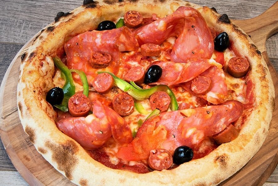 Mozarella fior di latte, jambon blanc supérieur, lardons fumés, oeuf, champignons de paris frais, olives