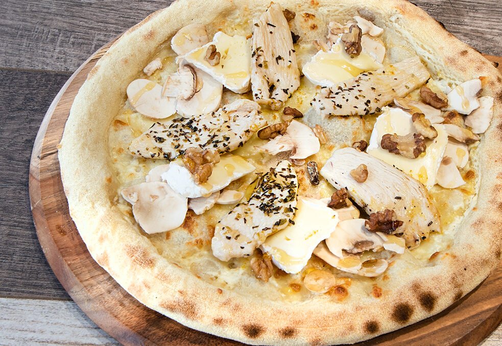Mozzarella fior di latte, camembert AOP, filet de poulet mariné, champignons de paris frais, miel du tarn, thym
